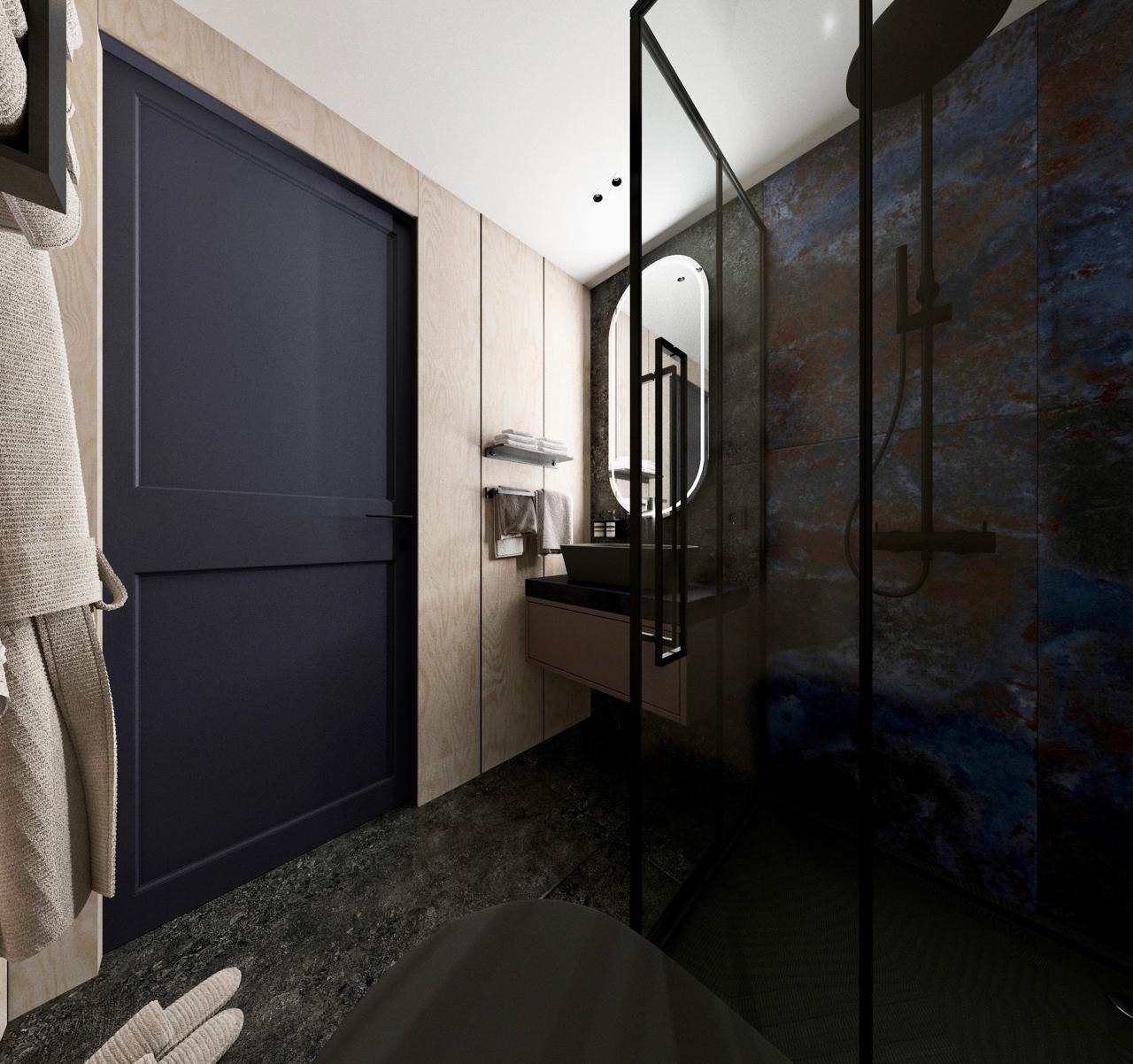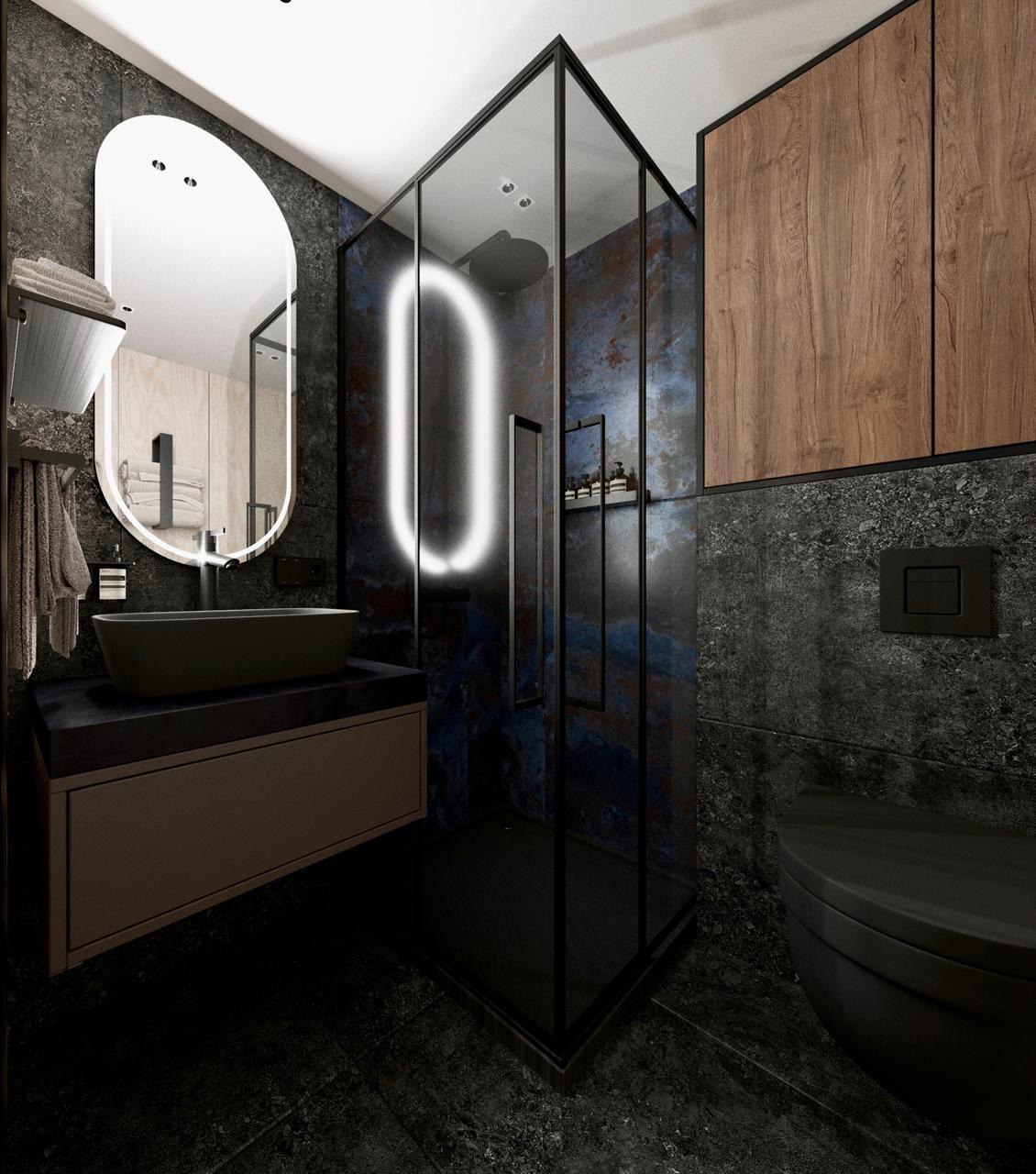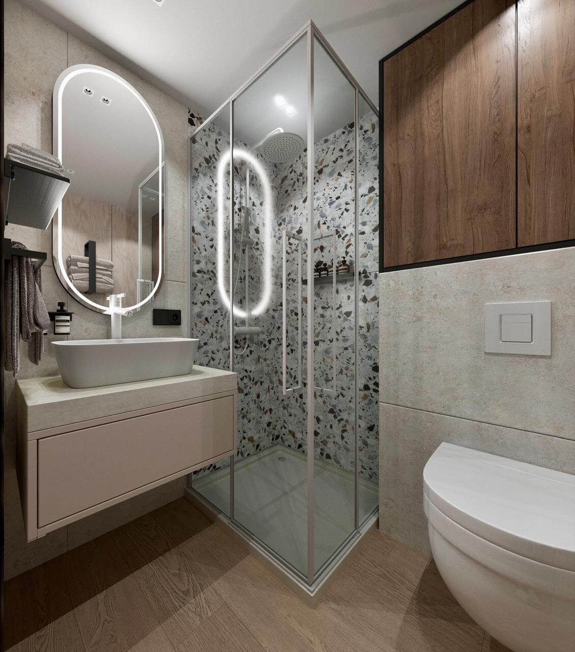 Плиточный или каменный поддон в душевой, водонагреватель, унитаз, раковина, зеркало