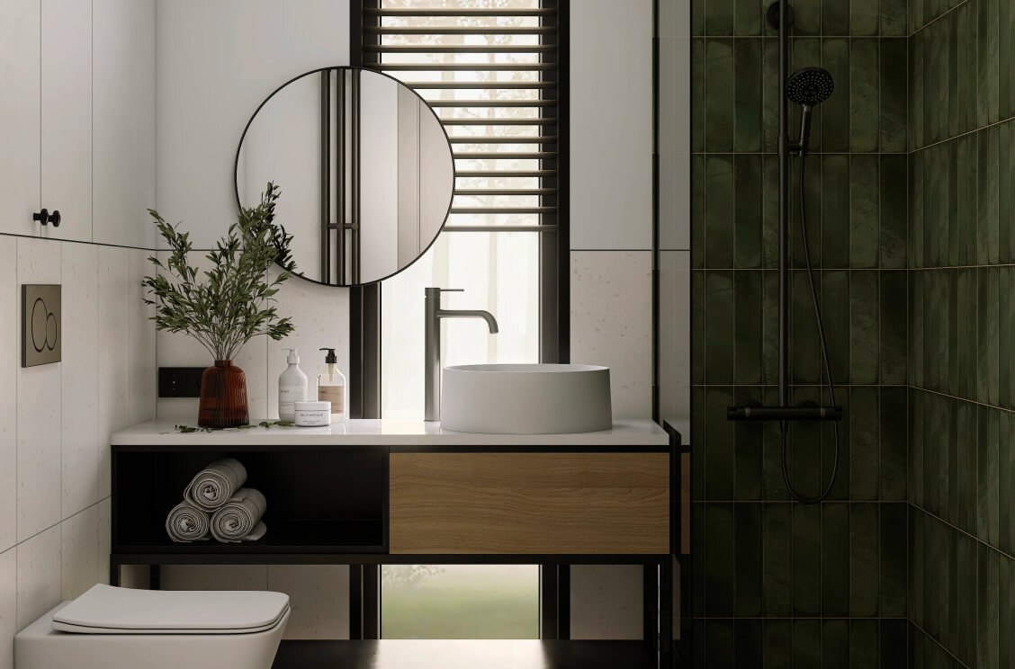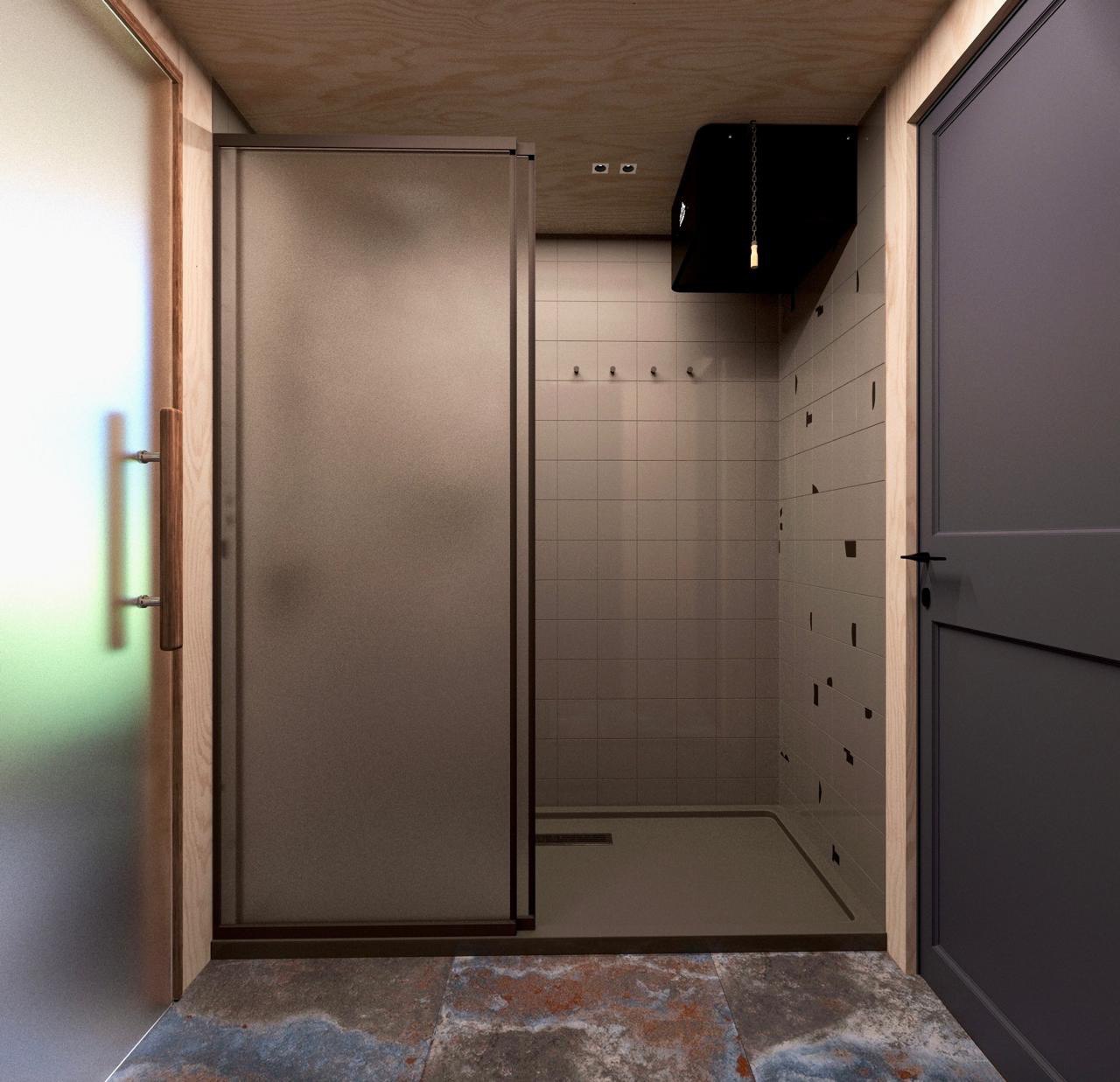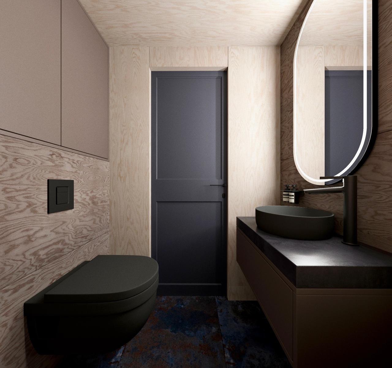 Плиточный или каменный поддон в душевой, водонагреватель, унитаз, раковина, зеркало